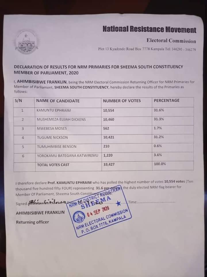 The NRM electoral commission returning officer for the party primaries in Sheema, Mr. Ahimbisibwe Franklin has declared Minister of Justice and Constitutional Affairs, Prof. Ephraim Kamuntu as the duly elected flag bearer for Sheema South Constituency.